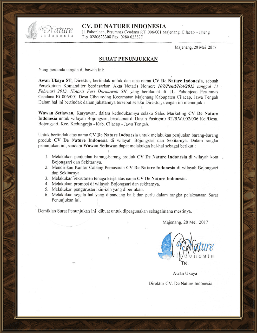 Berikut Surat Penunjukan Agen De Nature an Wawan Setiawan Yang ditandatangani langsung oleh Bpk Awan Ukaya