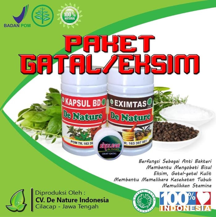 Paket gatal /exim de nature : Merupakan obat herbal yang sangat bagus untuk mengobati penyakit gatal. Tanpa perlu takut adanya efek samping karena murni terbuat dari bahan alami pilihan yang dikembangkan oleh denature indonesia. Tuntas dan cepat mengobati penyakit gatal, dalam waktu singkat. Obat Paket gatal /exim ini tidak tersedia di apotik. Karena dipasarkan secara ekslusif oleh denature indonesia. Untuk mendapatkannya Anda bisa langsung melalui